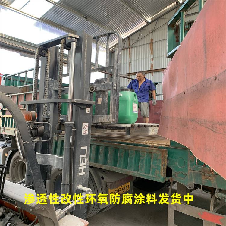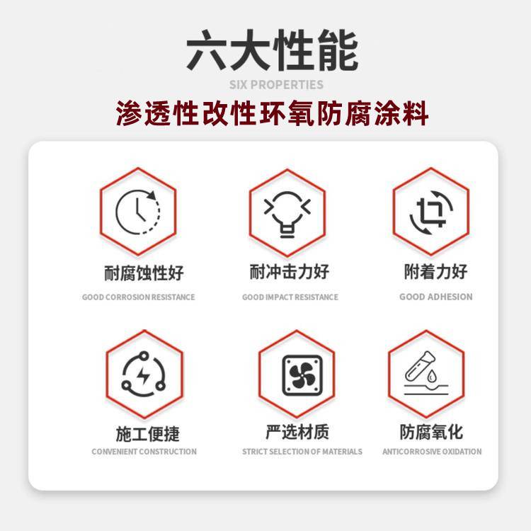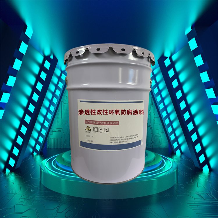 渗透性改性环氧防腐涂料为新型弹性体水性防腐涂膜材料,具有较强的耐酸、碱、盐和溶剂以及矿物油等腐蚀作用,对细菌不敏感,具有一定的抗臭氧能力,较高的延伸性能,抗裂性好,施工方便,干湿面均可施工,与混凝土有较高的粘结强度。