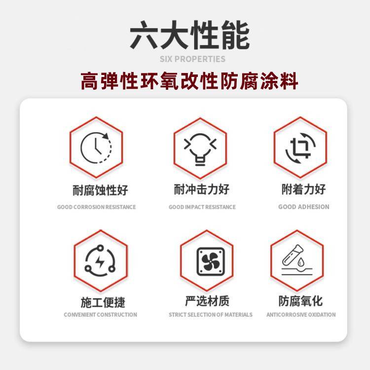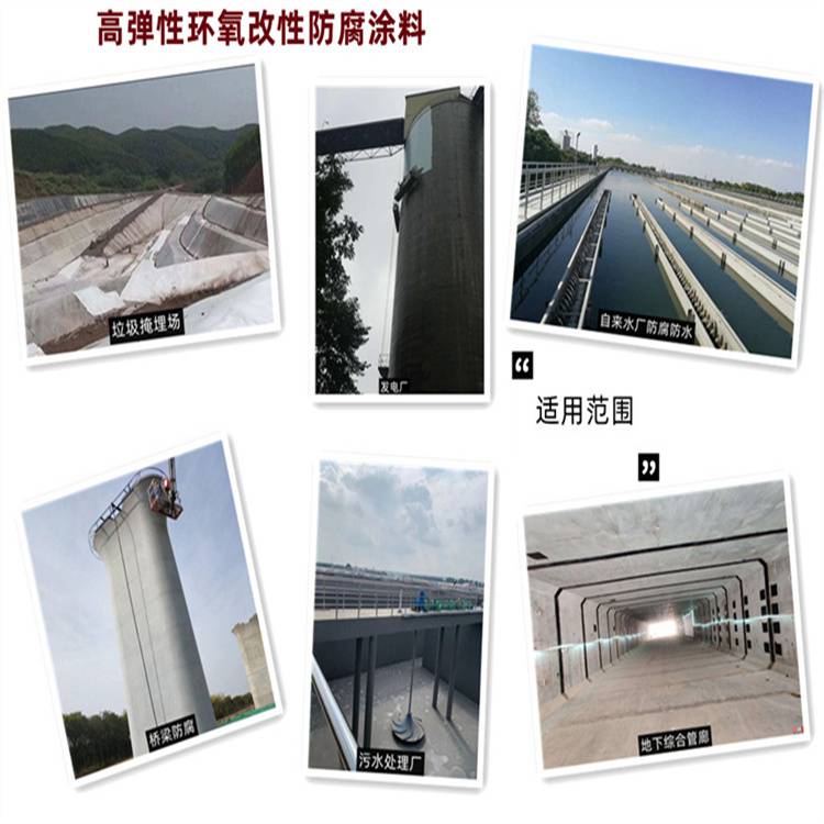 高弹性环氧改性防腐涂料污水处理厂,再生水厂等混凝土结构防腐蚀涂料产品之一,主要适用于工业污水、生活污水处理厂的混凝土构筑物的防护抗渗,也适用于食品工业、生物工程、制药、自来水水厂等环境的防腐,输水管道的防护,还适用于发电厂晾水塔内壁的防腐,垃圾掩埋场砼结构防腐。