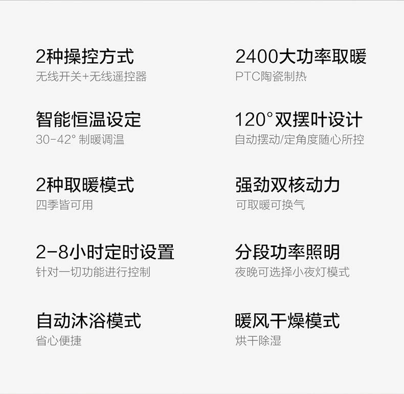 欧普照明浴霸灯具备强暖25分钟+换气5分钟,自动循环四次;自动沐浴功能:取暖60分钟+吹风15秒+换气5分钟后自动关闭