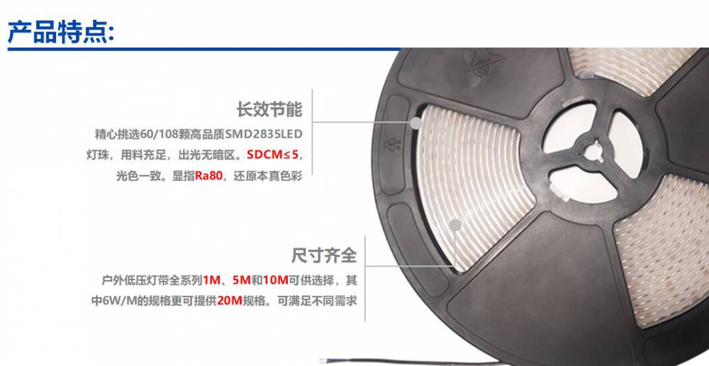 尺寸齐全户外低压灯带全系列1M、5M和10M可供选择,其中6W/M的规格更可提供20M规格。可满足不同需求