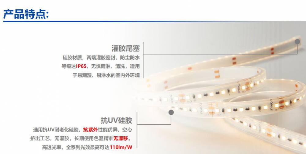 抗UV硅胶选用抗UV耐老化硅胶,抗紫外性能优异,空心挤出工艺,无灌胶,长期使用色温无漂移。高透光率,全系列光效可达110lm/W