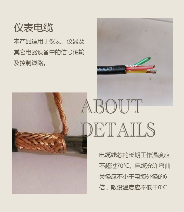 仪表电缆本产品适用于仪表、仪器及其它电器设备中的信号传输及控制线路,电缆线芯的长期工作温度应不超过70℃℃。电缆允许弯曲关径应不小于电缆外径的6倍,敷设温度应不低于0°C