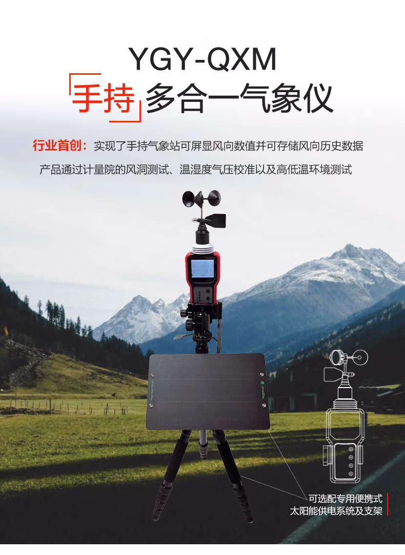 手持多合一气象仪,是一款携带方便,操作简单,集多项气象要素于一体的可移动式气象观测仪器。产品采用精密传感器及智能芯片,能同时对风速、风向、气压、温度、湿度、浪高、GPS经纬度、风级、风寒、露点、海拔等多项环境要素进行准确测量、记录并存储。仪器带有风向传感器和电子罗盘,能够直接实时测量显示8方位和0-359°的风向数据。可以对各要素进行实时数据测量,同时还可以读取各要素的平均数据和最大数据。仪器还有声光报警功能,报警功能可以对风速、气压、温湿度等要素进行监控,当相应的实时数据超过了设置的上下限时,仪器进行声光报警。手持气象仪电池在节能情况下能够长时间工作,不同的工作环境下执行不同的节能方案,包括关闭背光、关闭屏幕、自动关机,电量不足时自动关机。另外可以选配专用气象支架和太阳能供电系统,满足户外固定位置长期无人值守观测。内置大容量FLASH存储芯片可存储至少一年的气象数据;通用USB通讯接口,使用配套的USB线缆和气象站软件即可将数据下载到电脑,方便用户对气象数据的进一步处理分析。可选内置GPRS及GPS模块,可以方便的与物联网软件或其他软件进行对接,免去了外接GPRS模块,集成度高,可靠性好。本仪器可广泛应用于气象、环保、机场、农林、水文、军事、仓储、科学研究等领域。