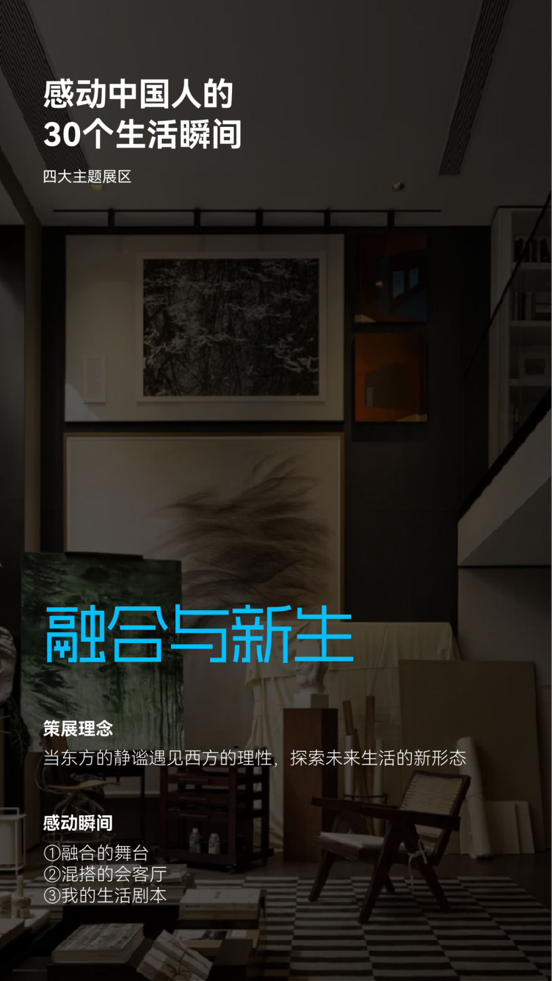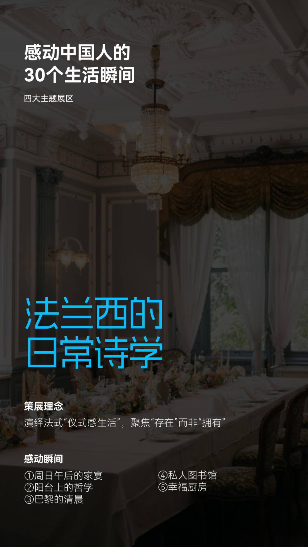 展区规划四大主题场景,深度诠释生活感动瞬间,围绕“世界的回响、法兰西的日常诗学、东方的智慧栖居、融合与新生”四大主题,将品牌融入生活场景,打造差异化记忆点。