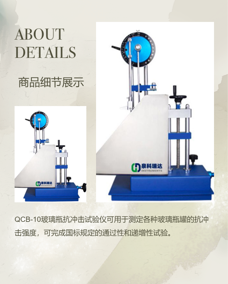 随着包装行业的不断发展,玻璃瓶作为食品、饮料尤其是酒类产品的重要包装材料,其安全性和耐用性越来越受到重视。尤其是在运输和存储过程中,玻璃瓶的抗冲击能力直接影响产品的完整性和客户体验。针对这一需求,山东泉科瑞达仪器设备有限公司推出的酒瓶玻璃瓶抗冲击测定仪,为行业提供了一种精准、高效的检测工具。
