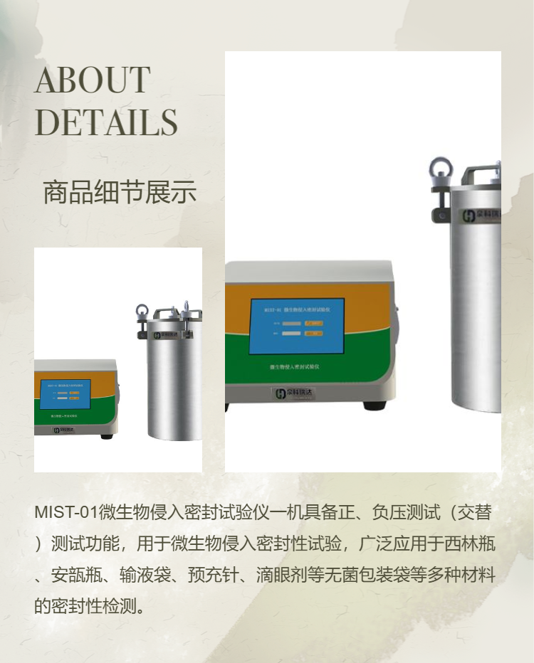 无菌包装密封完整性测试仪的应用场景无菌包装密封完整性测试仪主要针对无菌制剂、注射剂、冻干粉针剂及相关医疗包装物的密封状态进行检测。这种检测对于保障无菌环境,实现药品的高质量控制至关重要。