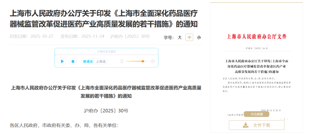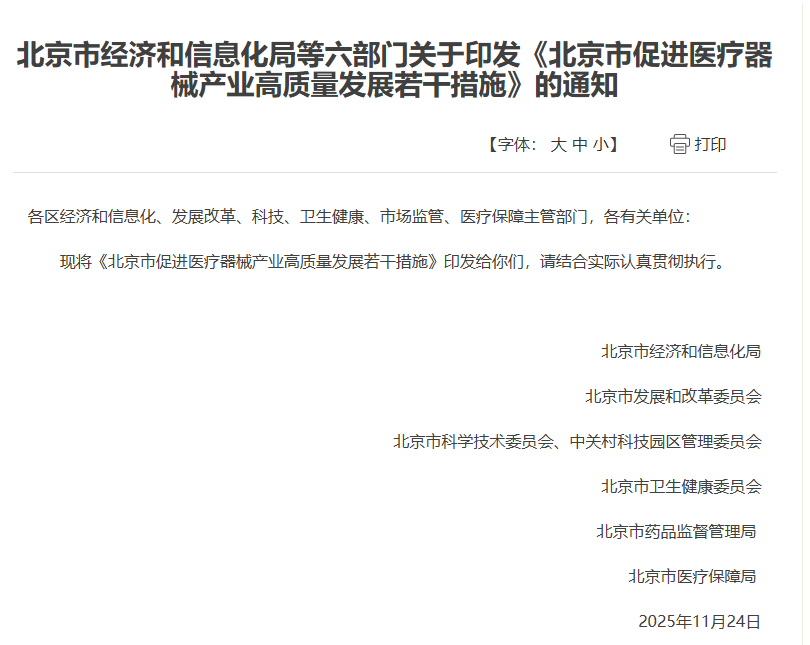 11月24日,上海市人民政府办公厅印发《上海市全面深化药品医疗器械监管改革促进医药产业高质量发展的若干措施》,为加快促进上海市医药产业高质量发展,提出二十二条相关要求;无独有偶,11月24日,北京市经信局、北京市卫健委、北京市药监局、北京市医保局等六部门印发《北京市促进医疗器械产业高质量发展若干措施》,共十五条,自发布之日起实施,有效期至2028年12月31日。