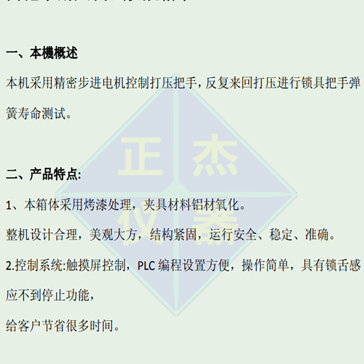 我的观点:选择合适的检测设备,是制造商提升竞争力的重要手段门窗执手及门把手的质量不能仅仅依靠外观和简单的功能测试,疲劳试验机及耐久检测设备的介入为产品质量提供了科学、客观的判断依据。尤其是在竞争激烈和市场需求多样化的背景下,制造商应重视设备的准确性和稳定性。东莞市正杰仪器科技有限公司的专业设备能够有效满足这一需求,助力企业提升产品竞争力,实现品质与效率的双重提升。