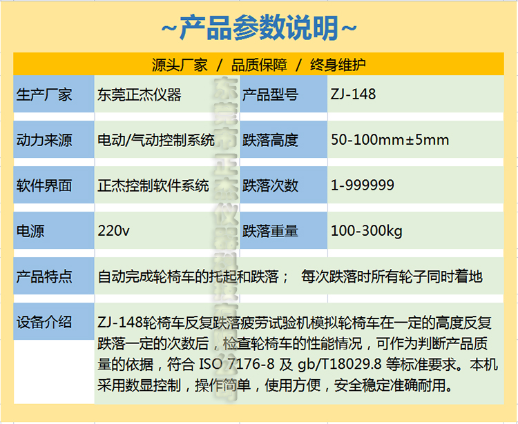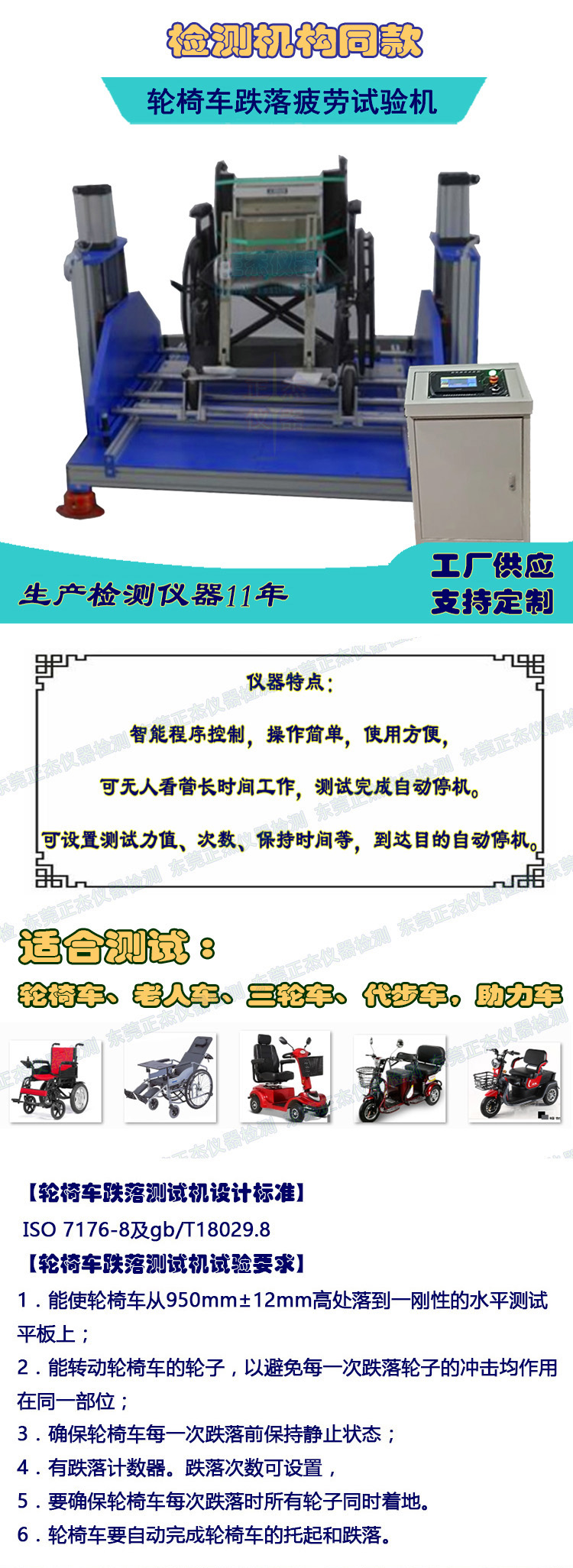 随着社会对康复辅助器具质量安全的关注不断提升,轮椅制造企业亟需科学、有效的测试设备支持。东莞市正杰仪器科技有限公司的定制轮椅车跌落强度试验机和反复落下疲劳测试机,以其专业性、精准性和定制化优势,成为保障产品质量与安全的理想选择。希望广大轮椅制造商能重视质量检测投入,实现产品的高品质发展,共同推动行业健康进步。
