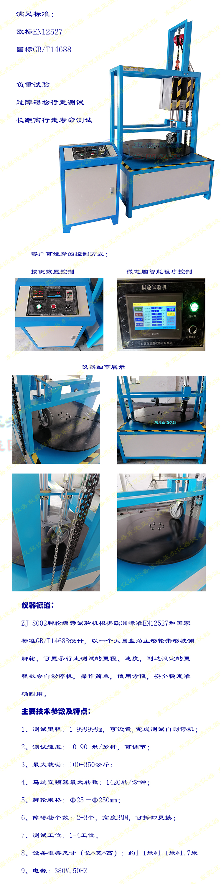随着物流、仓储、工业设备的快速发展,脚轮作为连接设备和地面的重要部件,其性能直接影响设备的运行效率和使用寿命。专业的脚轮行驶疲劳试验机、轮子灵活性测试机以及滚轮寿命试验机成为保障脚轮品质和功能的关键设备。东莞市正杰仪器科技有限公司专注于研发与制造这类测试仪器,为行业提供可靠的质量保证工具。