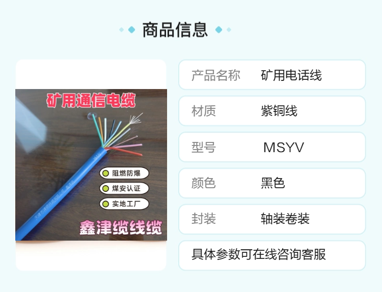 MHYV矿用阻燃电话线、防爆网线的定价为1.20元每米,这一价格是基于产品的制造成本、性能标准与市场需求综合制定的。相较于普通民用通信线缆,矿用特种线缆在原材料、生产工艺、检测流程上的成本更高,而1.20元每米的定价既保证了产品的高品质与安全性,又为矿山企业提供了高性价比的选择。矿山企业在选择通信线缆时,不能仅关注初期采购成本,更要考虑产品的使用寿命、安全性能以及故障维修带来的隐性成本。津缆线缆的MHYV系列产品能够在井下恶劣环境中稳定运行5年以上,避免因线缆故障导致的停产与安全风险,从长期来看,是一种更具经济性的安全投入。
