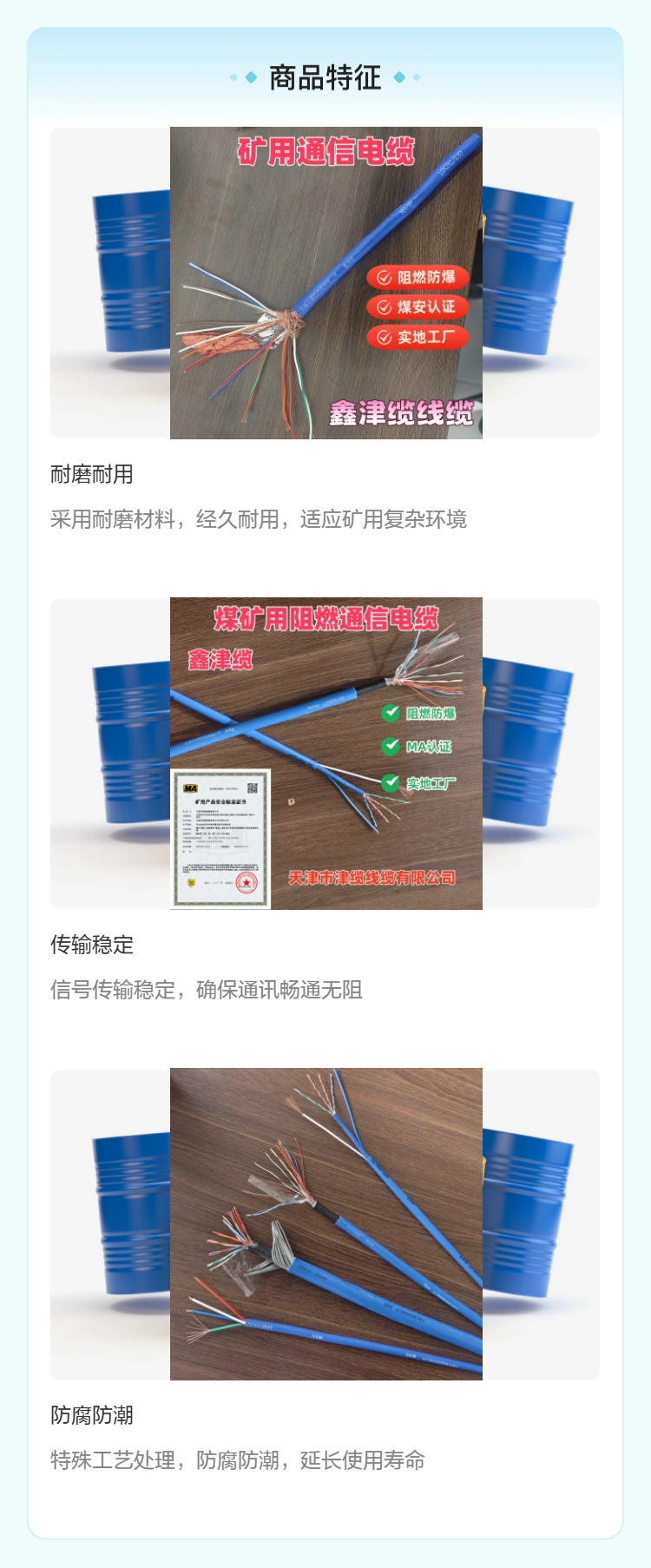 矿用防爆网线的差异化竞争优势津缆线缆推出的MHYV系列防爆网线,在传统矿用电话线基础上进行了技术升级,针对井下数字化通信需求优化了性能。与普通矿用电话线相比,防爆网线的线对绞距经过精密调整,能够支持更高速率的数据传输,满足井下监控摄像头、传感器等设备的网络连接需求。其护套层采用加厚阻燃材料,并添加了抗静电成分,可有效释放井下积累的静电电荷,避免因静电火花引发的爆炸风险。此外,线缆的整体结构经过防爆认证机构检测,所有连接节点与绝缘层均符合矿用防爆标准,能够在瓦斯、煤尘等爆炸性环境中安全使用,填补了井下高速防爆通信的市场空白。