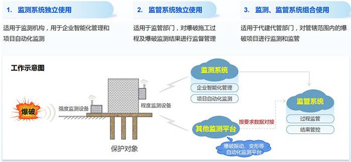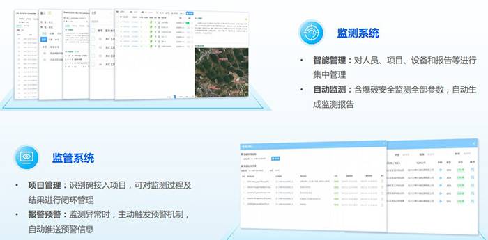 平台由监测和监管两个系统构成,系统间数据互通,可独立使用,也可组合使用,能应对各种爆破安全监测项目的监测(监管)需要。