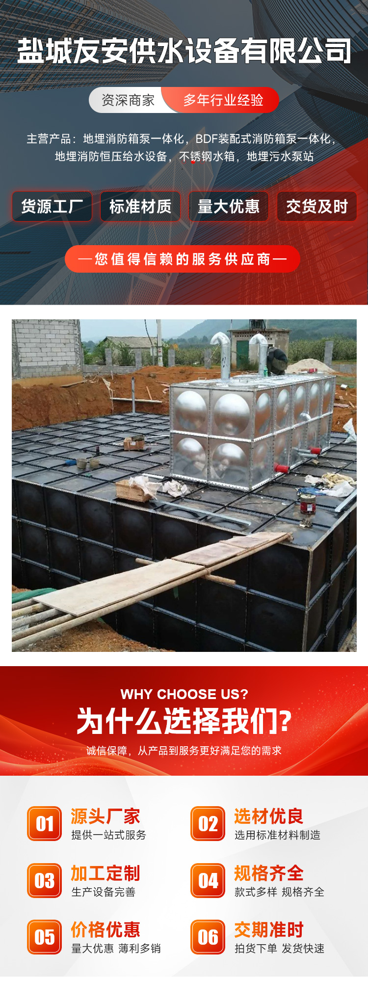 选择盐城友安供水设备有限公司的理由在众多的消防设备供应商中,选择盐城友安供水设备有限公司具有诸多理由。首先,公司的产品质量可靠,经过了严格的质量检测和认证。无论是大模块消防水箱,还是其他相关产品,都能够满足国家和行业的标准要求。