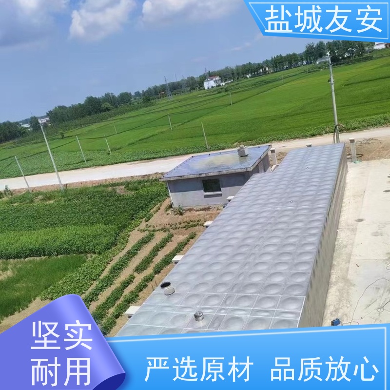 多场景适配:不锈钢生活水箱与不锈钢消防水箱的功能协同演进现代建筑对水系统的功能需求日益复合化。盐城友安突破单一用途思维,开发出具备双系统接口的方形水箱结构:同一不锈钢水箱体,既可作为独立不锈钢消防水箱满足GB50974强制要求,亦可通过增设隔膜气压罐与变频泵组,无缝接入生活供水系统,成为不锈钢生活水箱。其内部采用食品级EPDM橡胶隔膜分隔消防与生活用水区域,杜绝交叉污染;溢流管、通气管、人孔盖等附件均按《建筑给水排水设计标准》(GB50015)独立设置,确保消防用水专水专用。在盐城某新建三甲医院项目中,该方案使屋面设备占地减少35%,避免了传统双箱并置带来的荷载叠加与维护冲突,印证了方形水箱在空间受限场景下的buketidai性。