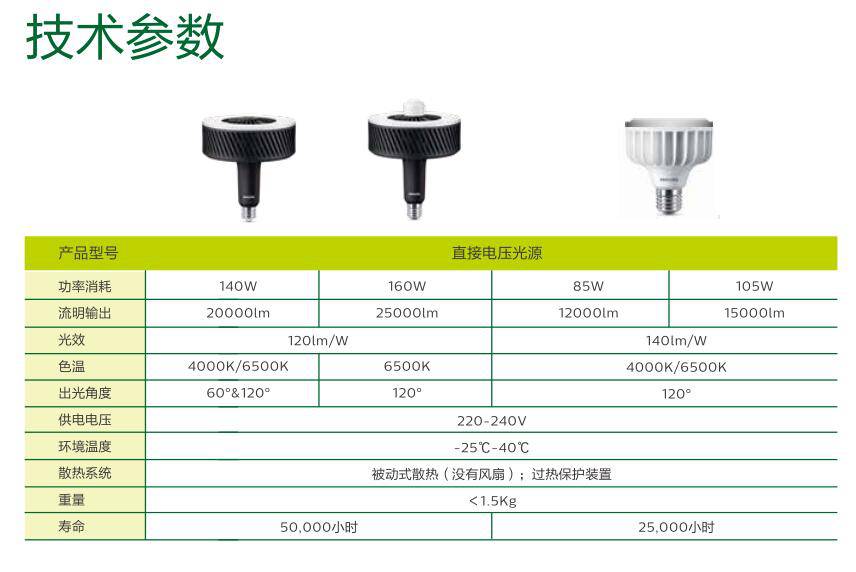 飞利浦LED高天棚光源系列为轻松替换与低维护成本的长期解决方案,85W/105W/140W/160W可以取代250/400/400W以上的HID光源,提供高亮附带感应版本,节能可达95%。初始投入低,可快速回本,为仓库、工厂、购物中心、运动场馆、交通枢纽、会展中心高天棚照明的节能之选