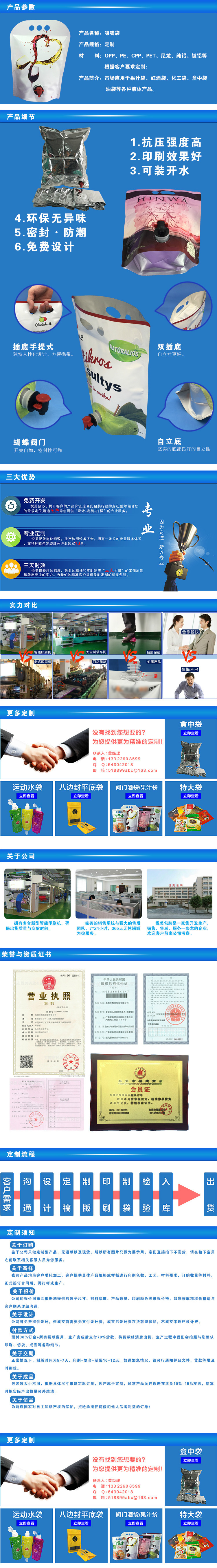 应 用:市场应用于果汁袋、红酒袋、化工袋、盒中袋、油袋等各种液体产品,